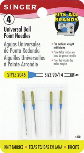 Singer universal ball point yellow band machine needles (size 90/14) are designed for sewing medium weight knit fabrics. Singer machine needles are universal and can be used on singer, brother, kenmore and other quality sewing machines. Singer color-coded needles make it easy to select the proper needle and size. Package includes 4 size 90/14 needles..../ Singer Universal Ball Point Machine Needles for Knit Fabric, Size 90/14, 4-Pack / sewing machines